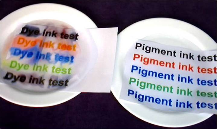 防水性是兩款墨水最明顯的差異。左為染料(Dye)墨水,右為顏料(Pigment)墨水。 |